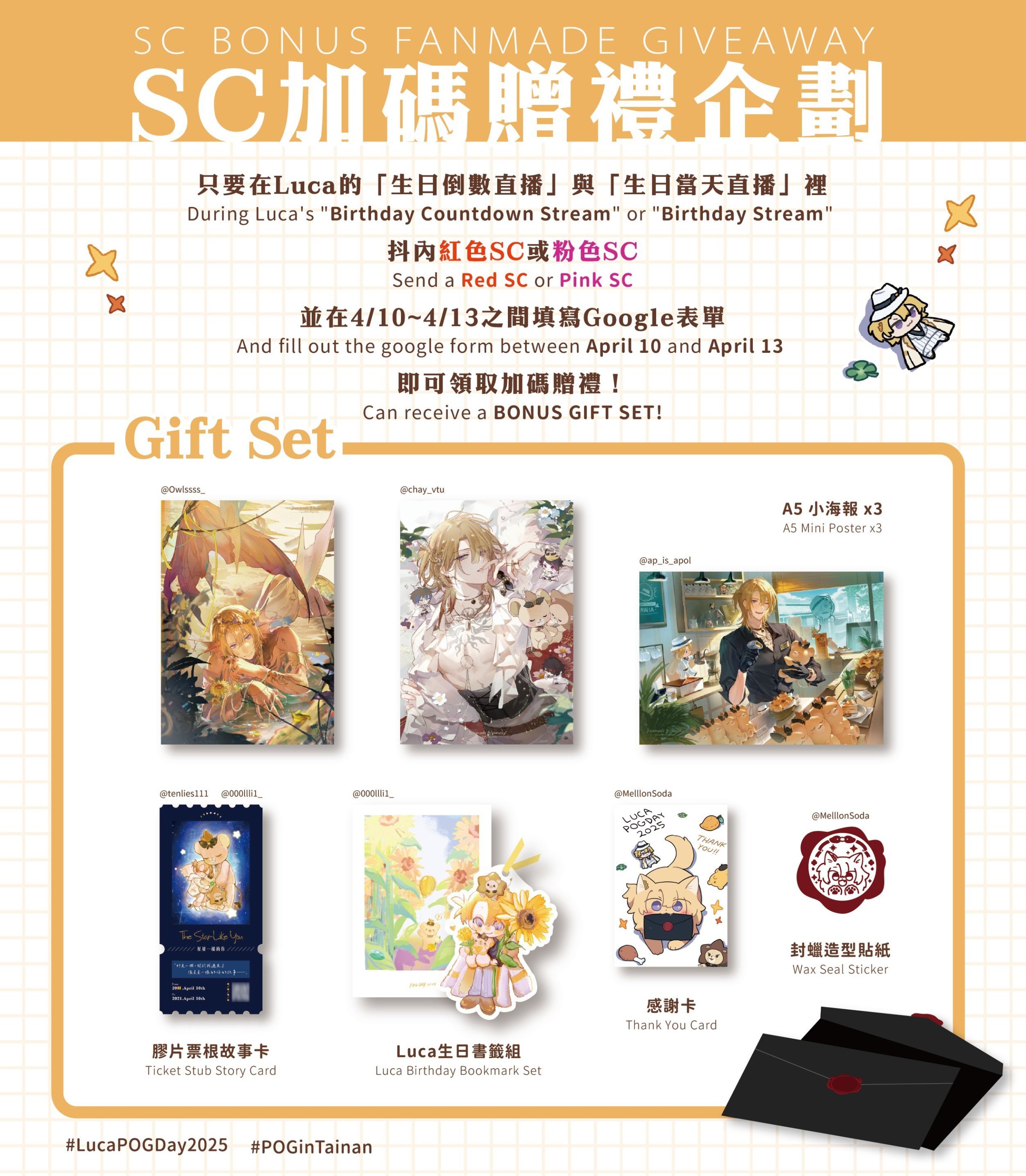 Simply, send a red or pink superchat in Luca's "Birthday Livestream" and fill out the form between 4/10~4/13. You can receive additional gifts!